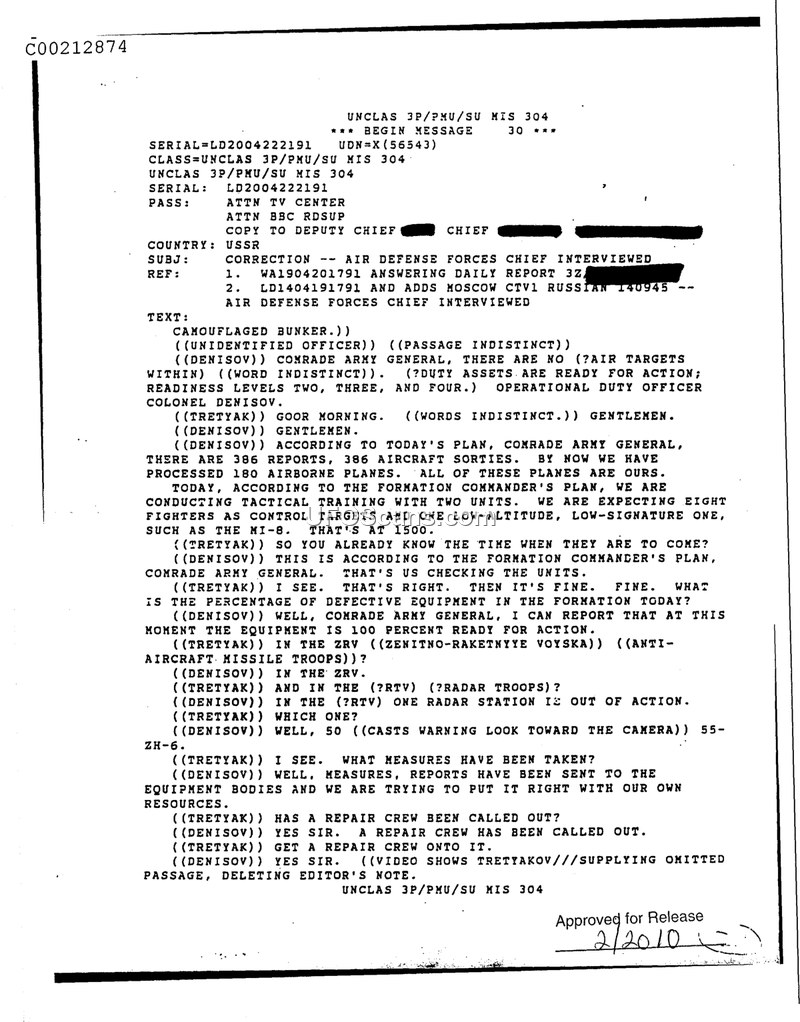 This document is a transcript of an interview concerning the operational status of the Soviet Air Defense Forces. The dialogue takes place between an Army General, identified as Tretyak, and an Operational Duty Officer, Colonel Denisov. The conversation focuses on the daily operational plan, which includes 386 aircraft sorties and the processing of 180 airborne planes. A significant portion of the discussion pertains to tactical training exercises, specifically the use of eight fighters as control targets and one low-altitude, low-signature target, identified as a Mi-8 helicopter. General Tretyak questions the readiness of the units, specifically inquiring about the percentage of defective equipment. Colonel Denisov reports that the equipment is 100 percent ready, though he acknowledges that one radar station within the Radar Troops (RTV) is currently out of action. The General demands to know what measures have been taken to address this, and Colonel Denisov confirms that a repair crew has been dispatched to resolve the issue. The transcript concludes with a note that the video shows Tretyak, with some passages omitted by the editor.