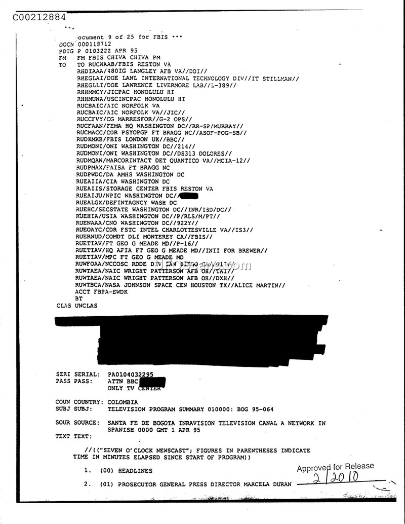 This is an FBIS television program summary from Colombia dated April 1, 1995. It lists a broad distribution of U.S. intelligence and military agencies and notes the start of a news broadcast.