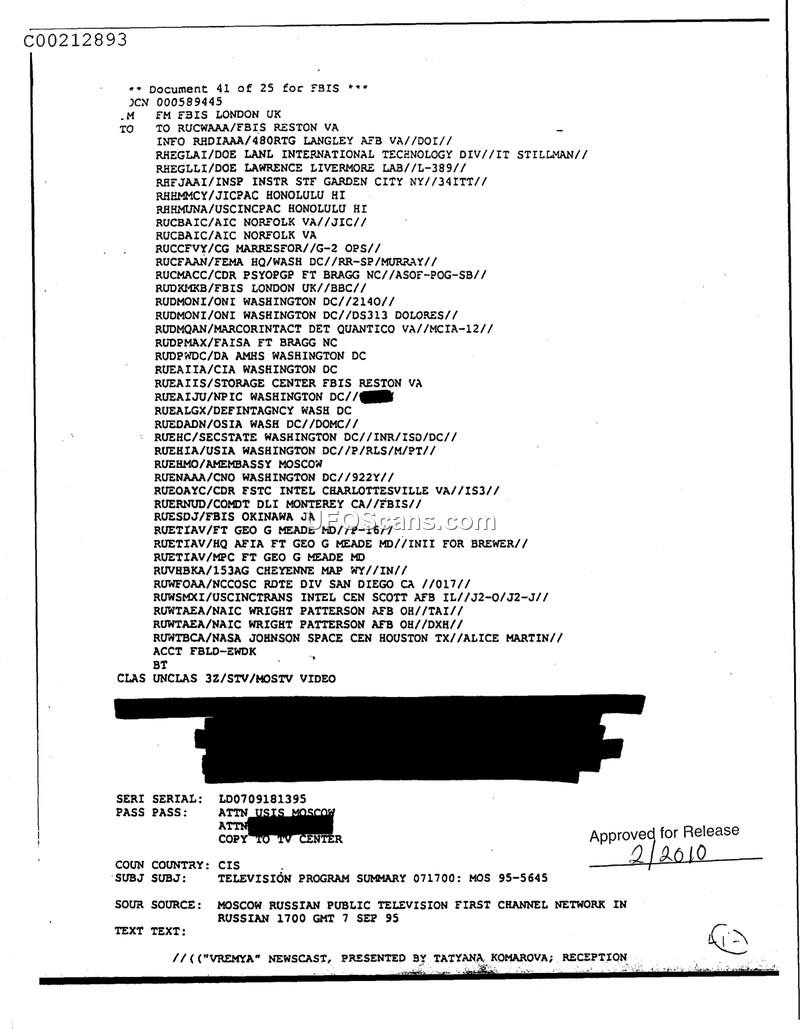 This document is a Foreign Broadcast Information Service (FBIS) summary of a television program broadcast on the Russian Public Television First Channel Network. The summary covers the 'Vremya' newscast, which was presented by Tatyana Komarova. The document is dated 7 September 1995, at 1700 GMT. It serves as a distribution record for various US government and military intelligence agencies, including the CIA, NASA, and various military intelligence units. The document itself contains no specific content regarding the substance of the news report, as the text is redacted following the header information.