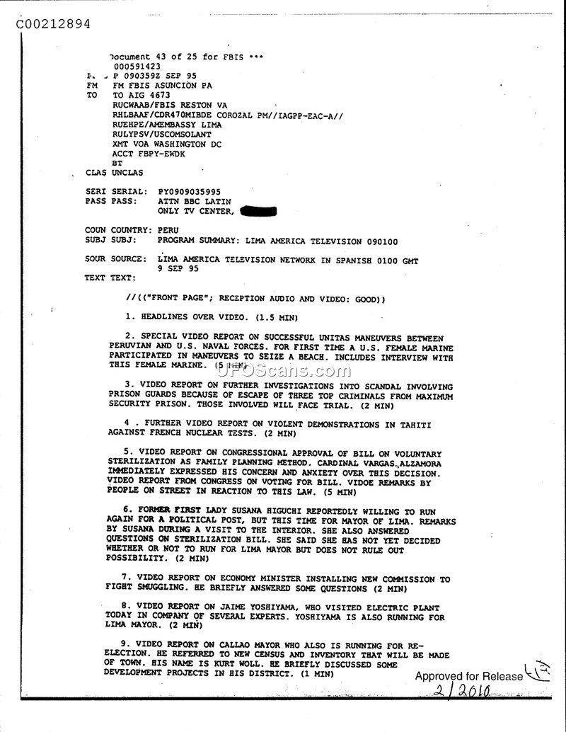 This document is a Foreign Broadcast Information Service (FBIS) summary of a television broadcast from Lima, Peru, dated September 9, 1995. The report outlines nine distinct news segments aired by the Lima America Television network. The broadcast covered a variety of political and social issues, including joint naval maneuvers between Peruvian and U.S. forces, which notably featured the participation of a female marine for the first time. Other segments detailed a scandal involving the escape of three high-profile criminals from a maximum-security prison, violent demonstrations in Tahiti regarding French nuclear testing, and the congressional approval of a bill concerning voluntary sterilization as a family planning method, which drew criticism from Cardinal Vargas Alzamora. The broadcast also covered local political developments, including the potential candidacy of former First Lady Susana Higuchi for the office of Mayor of Lima, the activities of mayoral candidate Jaime Yoshiyama, and the re-election campaign of Callao Mayor Kurt Woll, who discussed new census and development projects. Additionally, the report mentioned the Economy Minister's efforts to combat smuggling through the establishment of a new commission.