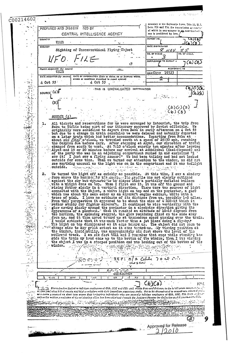 This intelligence report, prepared by the Central Intelligence Agency and dated November 8, 1955, details a sighting of an unconventional flying object by a group of travelers in the USSR. The witnesses were traveling by train from Baku to Tiflis on October 4, 1955. At approximately 7:10 p.m., ten minutes after departing from the station at Adzhikibul (Kazi-Magomed), a member of the party alerted the others to an object outside. The witness described the object as having a profile similar to a partially deflated balloon with a slight dome on top. It was initially observed rising slowly from the ground. The object featured two light sources: a white light on top and another on the perimeter, which appeared to have a trace of pink. The witness estimated the object's size to be comparable to a MIG-15 aircraft. The object rose to an altitude of 10-15 degrees from the horizon, where it began to spin, creating a glow that resembled a pinwheel. After the spinning ceased, the object moved toward the train at a speed described as significantly faster than a jet aircraft. The witness, who was observing from a stooped position at the train window, noted that the object did not appear to change size as it approached. The report is marked as unevaluated information.