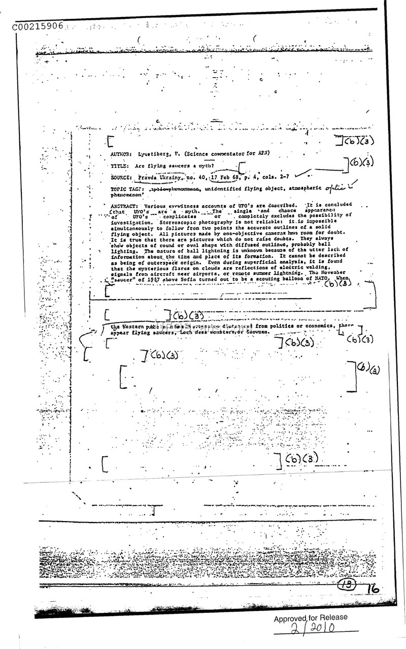 A 1968 intelligence assessment from Pravda Ukrainy dismisses UFOs as myths, attributing sightings to natural phenomena or military equipment like NATO balloons. It suggests public interest in UFOs is a distraction from real-world political and economic concerns.