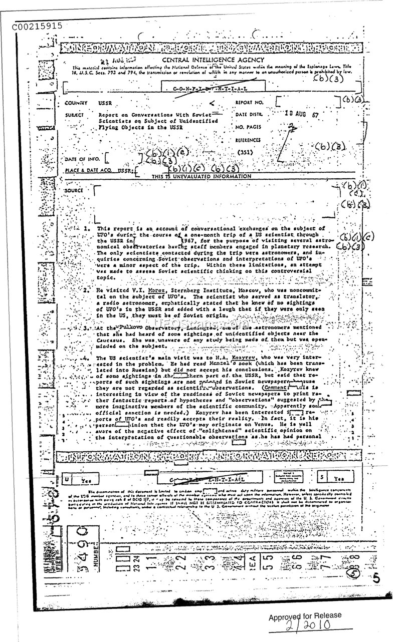 A 1967 CIA report documenting a US scientist's conversations with Soviet astronomers regarding UFOs. While most Soviet scientists were skeptical or dismissive, N.A. Kozyrev expressed personal belief in the reality of UFOs.