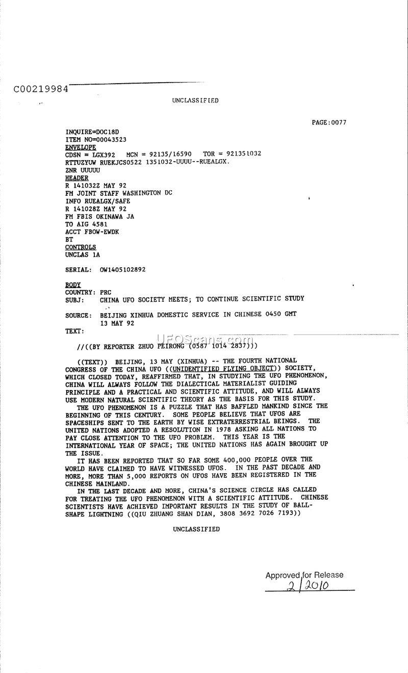 The China UFO Society held its Fourth National Congress in May 1992, reaffirming a scientific approach to studying UFOs. The report notes over 5,000 UFO sightings in China over the previous decade.
