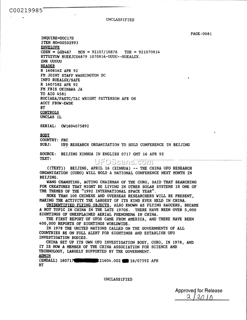This intelligence report, dated April 16, 1992, details an upcoming national conference to be held in Beijing by the China UFO Research Organization (CURO). According to the report, Wang Changting, the acting chairman of the CURO, stated that the conference would align with the themes of the 1992 International Space Year, specifically focusing on the search for extraterrestrial life. The event was expected to host over 100 researchers from China and abroad. The document provides historical context regarding the CURO, noting that it was established in 1978 following a United Nations call for governments to monitor UFO sightings. The CURO is described as a government-supported body and a member of the China Association for Science and Technology. The report also mentions that there have been over 5,000 reported sightings of unexplained aerial phenomena in China and approximately 400,000 reports worldwide.