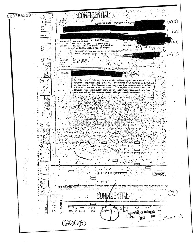 The CIA analyzed a metallic fragment recovered in the Republic of the Congo following a UFO sighting. The analysis concluded the object was an electrical component made of silicon-steel laminate.