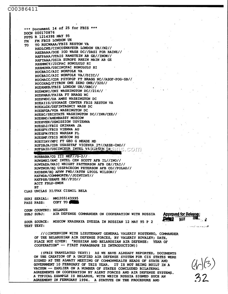This document is an intelligence report issued by FBIS London on 14 May 1995, detailing the status of air defense cooperation between Belarus and Russia. The report features an interview with Lieutenant General Valeriy Kostenko, the Commander of the Belarusian Air Defense Forces, conducted by Valeriy Kovalev. The core of the report concerns the implementation of a unified air defense system for the Commonwealth of Independent States (CIS). It highlights that the formal agreements for this unified system were signed during the Almaty meeting of Commonwealth heads of state and government on 10 February 1995. The text clarifies that this development did not occur in a vacuum; rather, it built upon existing bilateral agreements, specifically citing a cooperation agreement on alert forces and air defense systems signed between Belarus and Russia in February 1994. The document serves as a record of the political and military integration efforts regarding air defense infrastructure within the post-Soviet space during the mid-1990s.