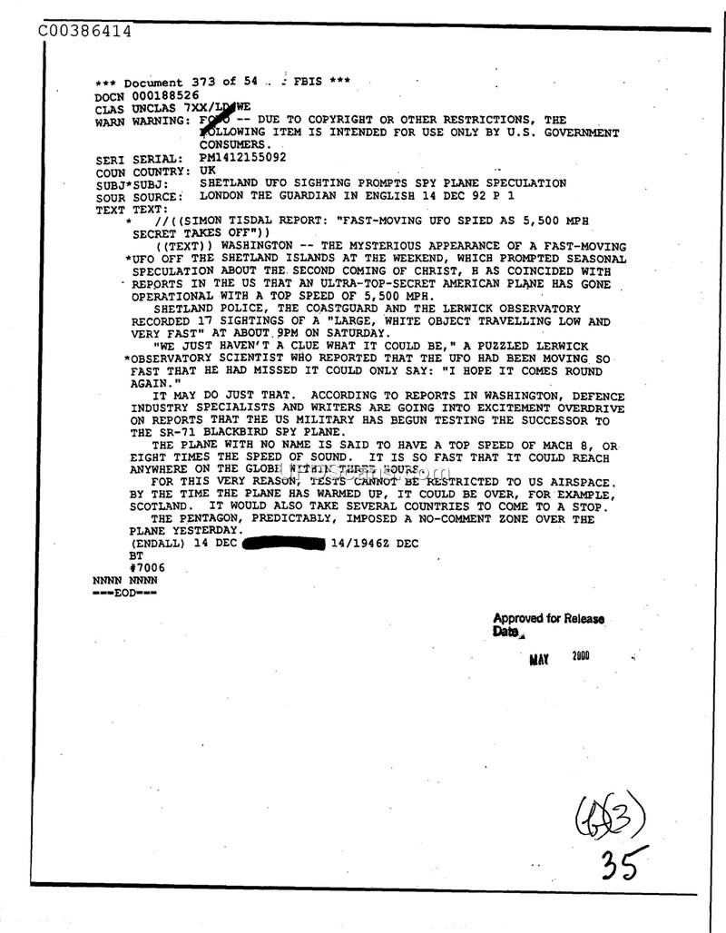 This document, a Foreign Broadcast Information Service (FBIS) report dated December 14, 1992, details a series of sightings in the Shetland Islands, Scotland. According to a report by Simon Tisdal published in The Guardian, the Shetland Police, the Coastguard, and the Lerwick Observatory recorded 17 sightings of a large, white object traveling at low altitude and high speed. A scientist at the Lerwick Observatory expressed confusion regarding the nature of the object, noting its extreme speed. The sightings prompted widespread speculation that the phenomena were related to a top-secret American aircraft, with some reports suggesting a successor to the SR-71 Blackbird capable of reaching speeds of Mach 8. The document notes that the Pentagon declined to comment on the matter, maintaining a 'no-comment zone' regarding the potential aircraft. The text highlights the geopolitical implications of such high-speed testing, noting that tests could not be restricted to U.S. airspace due to the aircraft's ability to traverse the globe in three hours.