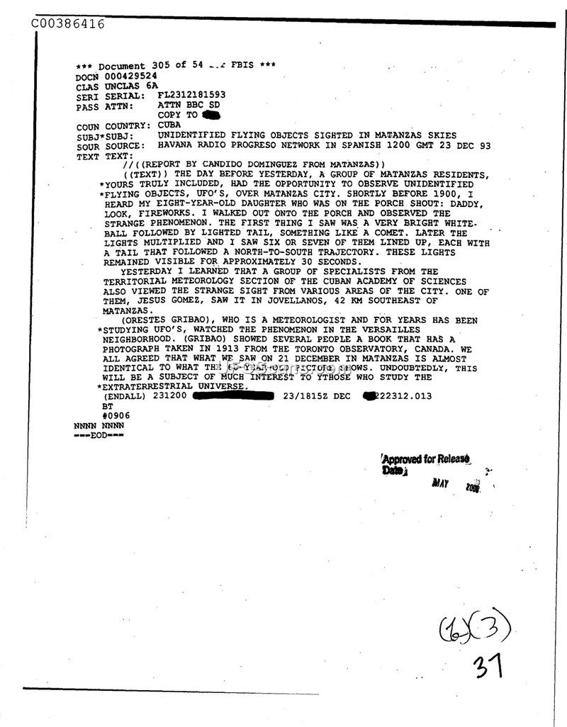 This document is an FBIS report dated December 23, 1993, detailing a sighting of unidentified flying objects in Matanzas, Cuba. The report, based on an account by Candido Dominguez, describes an event that occurred on December 21, 1993, shortly before 1900 hours. Dominguez, along with other residents, observed a group of six or seven bright white objects, each possessing a tail similar to a comet. These objects were observed moving in a north-to-south trajectory and remained visible for approximately 30 seconds. The report notes that specialists from the Territorial Meteorology Section of the Cuban Academy of Sciences also observed the phenomenon. Specifically, a meteorologist named Jesus Gomez reported seeing the objects from Jovellanos, located 42 kilometers southeast of Matanzas. Another meteorologist, Orestes Gribao, who has studied UFOs for years, observed the event from the Versailles neighborhood. Gribao compared the sighting to a 1913 photograph from the Toronto Observatory, suggesting a similarity between the two events. The document was declassified in May 2008.