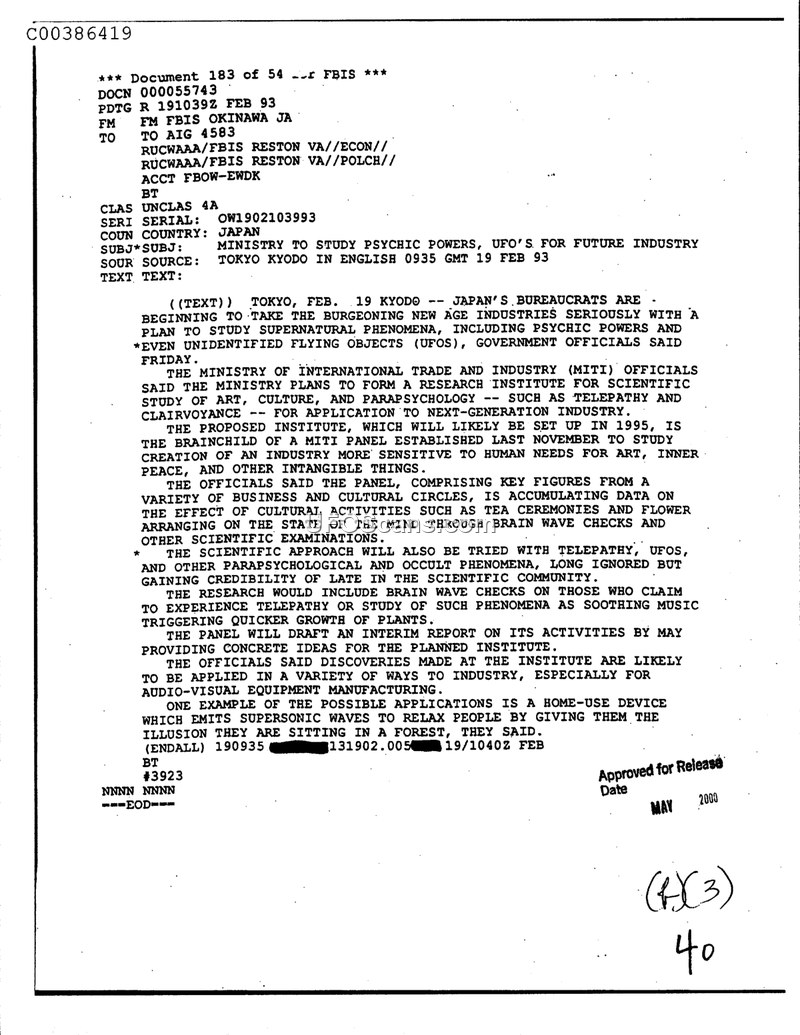 This document, a Foreign Broadcast Information Service (FBIS) report dated February 19, 1993, details a proposal by Japanese bureaucrats within the Ministry of International Trade and Industry (MITI) to create a research institute dedicated to the study of supernatural phenomena. The initiative, which officials indicated would likely be established in 1995, aims to investigate topics such as psychic powers, telepathy, clairvoyance, and Unidentified Flying Objects (UFOs). The project originated from a MITI panel formed to explore ways to make industry more responsive to human needs, including intangible aspects like art, culture, and inner peace. The panel, composed of figures from business and cultural circles, intends to apply scientific methods to these phenomena, including brain wave analysis. The ultimate goal of this research is to derive practical industrial applications, particularly for the audio-visual equipment manufacturing sector. Officials cited a potential home-use device that could emit supersonic waves to induce relaxation as an example of the type of technology that might emerge from these studies.