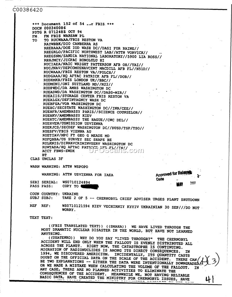 This 1994 intelligence report details an interview with Chernobyl advisers who claim the nuclear disaster is ongoing and that official data regarding the accident's scale is unreliable. It highlights the 1994 discovery of Americium as a consequence of the disaster.