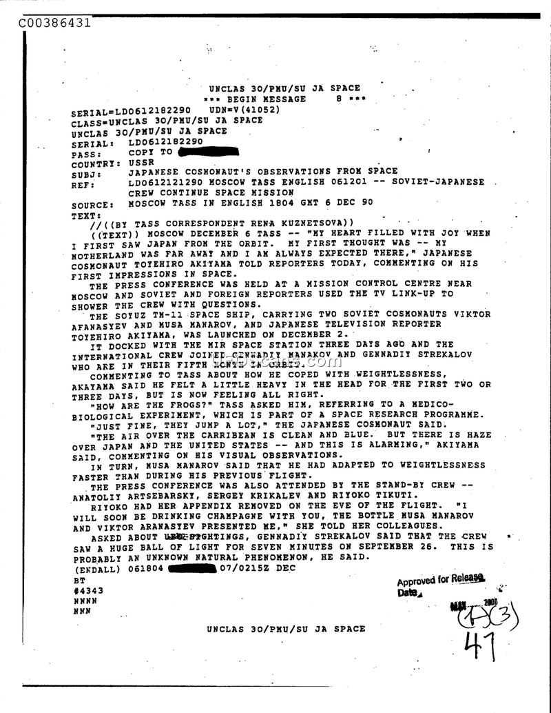 This document is a TASS press cable dated December 6, 1990, reporting on a press conference held at a mission control center near Moscow. The conference featured Japanese television reporter and cosmonaut Toyehiro Akiyama, who had recently joined the crew of the Mir space station alongside Soviet cosmonauts Viktor Afanasyev and Musa Manarov. Akiyama discussed his initial experiences with weightlessness and his visual observations of Earth from orbit, noting concerns about haze over Japan and the United States. During the briefing, Soviet cosmonaut Gennadiy Strekalov reported that the crew had observed a 'huge ball of light' for seven minutes on September 26. Strekalov stated that this event was likely an unknown natural phenomenon. The document also mentions the presence of the stand-by crew, including Anatoliy Artsebarsky, Sergey Krikalev, and Riyoko Tikuti.