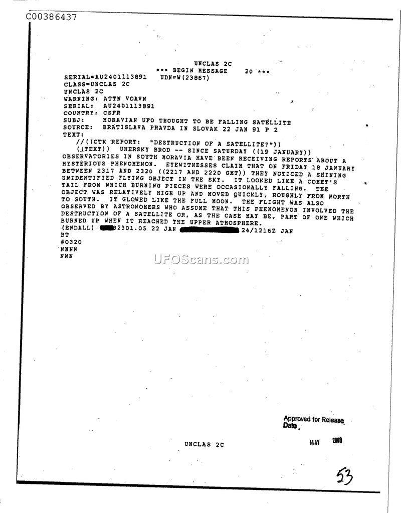 This document is a declassified intelligence summary reporting on a sighting of an unidentified aerial phenomenon in South Moravia, Czechoslovakia, on the night of January 18, 1991. According to a report from the Bratislava Pravda newspaper, eyewitnesses in the town of Uhersky Brod observed a mysterious object in the sky between 23:17 and 23:20 local time (22:17–22:20 GMT). The witnesses described the object as having a shining tail, similar to that of a comet, from which burning pieces were occasionally falling. The object was reported to be at a relatively high altitude, moving quickly from north to south, and emitting a glow comparable to that of a full moon. The incident was also observed by astronomers, who provided an official assessment that the phenomenon was likely the destruction of a satellite or a portion of a satellite burning up upon re-entry into the upper atmosphere.