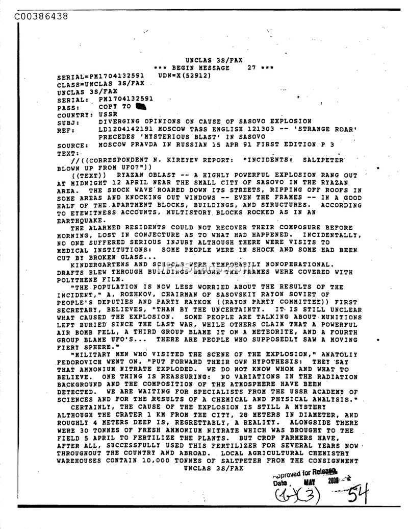 This document, a press report from Moscow Pravda dated April 15, 1991, details a powerful explosion that occurred near the city of Sasovo in the Ryazan Oblast of the USSR at midnight on April 12, 1991. The blast was significant enough to damage apartment blocks, buildings, and structures, ripping off roofs and shattering windows. While no serious injuries were reported, some residents suffered from shock or minor cuts from glass. The incident caused widespread confusion and speculation among the local population. A. Rozhkov, the Chairman of the Sasovskiy Rayon Soviet of People's Deputies, noted that the cause remained unclear, with theories ranging from the detonation of buried munitions from the last war to a meteorite strike or a UFO. The latter theory was supported by reports of individuals who claimed to have seen a moving fiery sphere. Military personnel who visited the site suggested that ammonium nitrate, which had been stored in the area for agricultural use, might have exploded. However, this remained a hypothesis pending further analysis by the USSR Academy of Sciences. The report highlights the presence of a crater measuring 28 meters in diameter and 4 meters deep, located 1 kilometer from the city, alongside a large quantity of ammonium nitrate fertilizer.