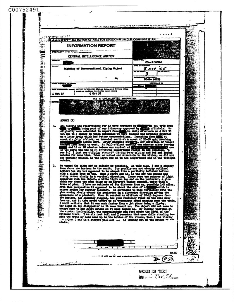 A CIA report documenting a 1955 sighting of an unconventional, glowing, spinning aerial object observed from a moving train. The object exhibited high-speed flight characteristics and unusual lighting.