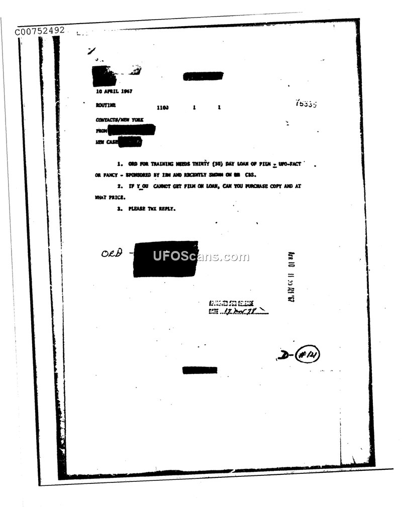 ORD FOR TRAINING NEEDS THIRTY (30) DAY LOAN OF FILM - UFO-FACT OR FANCY - SPONSORED BY IBM AND RECENTLY SHOWN ON CBS.