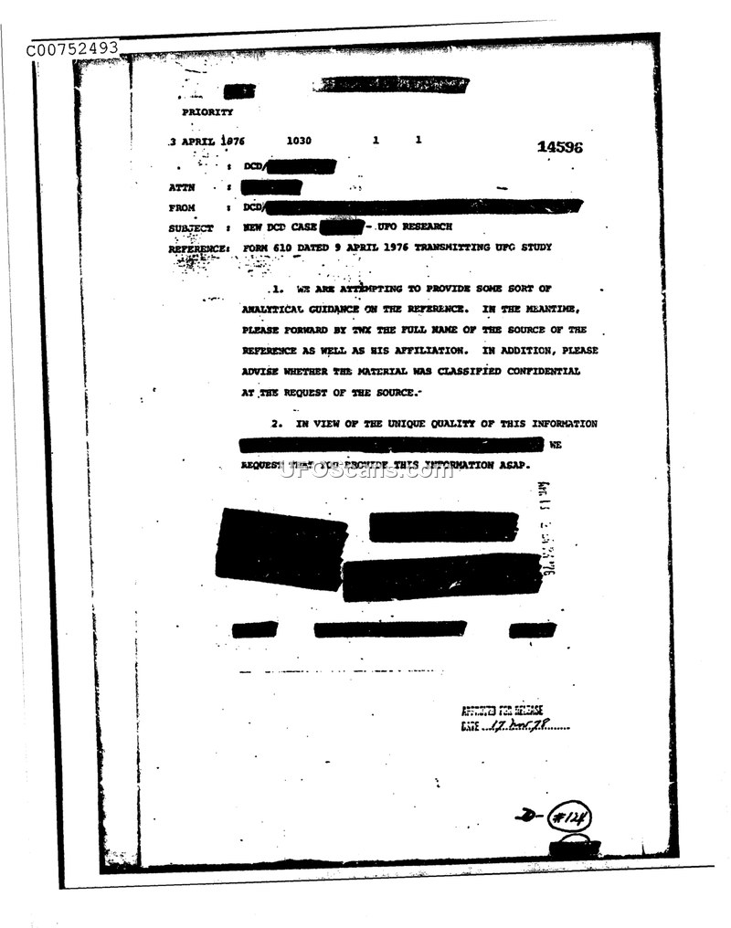 This document, dated April 13, 1976, is an internal communication within the DCD regarding a UFO research case. The author references a previous document, Form 610, dated April 9, 1976, which transmitted a UFO study. The primary purpose of this correspondence is to request additional information about the source of that study. Specifically, the author asks for the full name of the source and their professional affiliation. Furthermore, the author requests confirmation regarding whether the material was classified as 'Confidential' at the request of the source. The document emphasizes the 'unique quality' of the information provided in the study and requests that the recipient provide the requested details as soon as possible. The document was later approved for release on January 17, 1978.