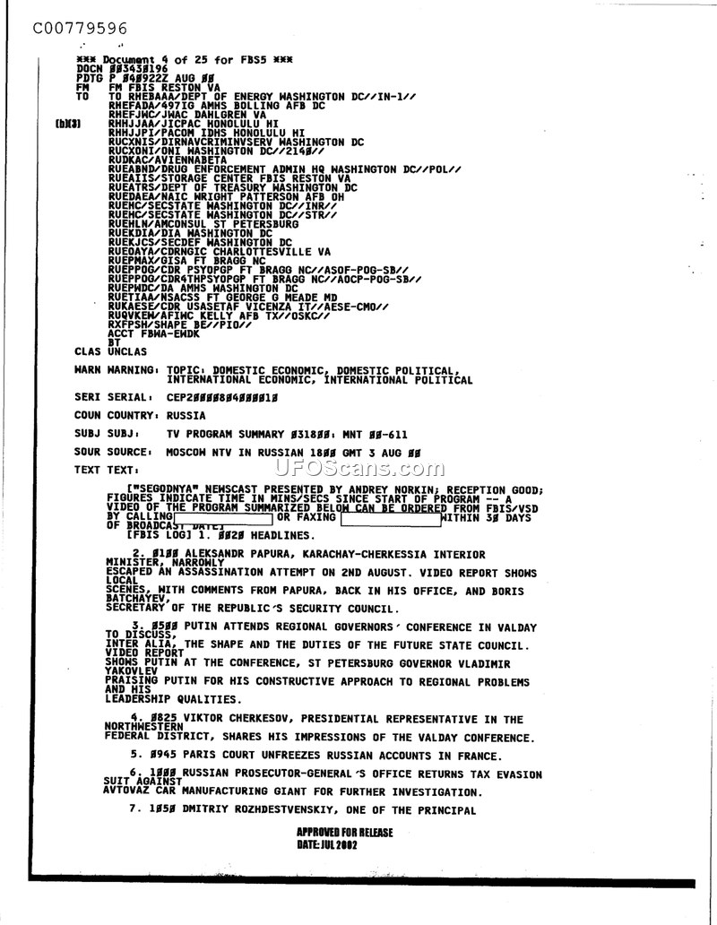 This document provides a summary of the August 3, 2000, Segodnya newscast in Russia. It highlights an assassination attempt on a regional minister and various political developments involving President Putin and the Russian judiciary.