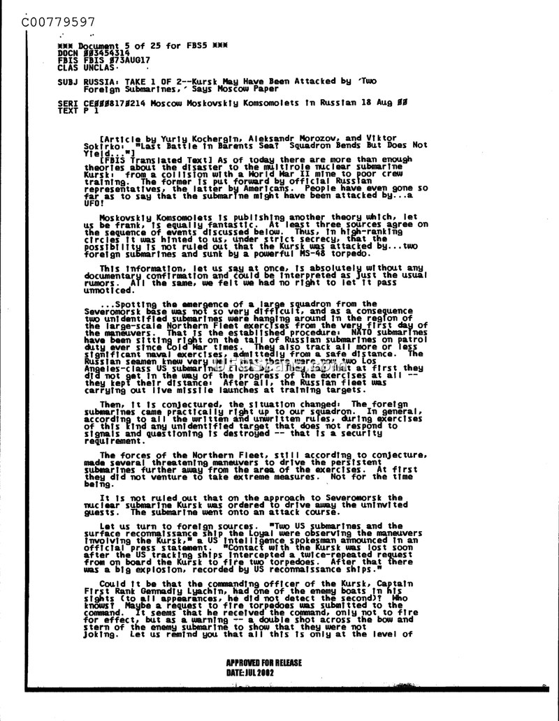 This document is an FBIS translation of an article published in the Russian newspaper Moskovsky Komsomolets on August 18, 2000. The article discusses various theories surrounding the disaster of the Russian nuclear submarine Kursk. The authors, Yuriy Kochergin, Aleksandr Morozov, and Viktor Sokirko, acknowledge that while there are many theories regarding the sinking—ranging from collisions with World War II mines to poor crew training—some have even suggested the involvement of a UFO. The newspaper presents a specific theory that the Kursk was attacked by two foreign submarines using a powerful MS-48 torpedo. The article details a scenario where foreign submarines were observing Russian Northern Fleet exercises. It claims that these submarines, identified as Los Angeles-class US vessels, initially kept their distance but later moved closer to the Russian squadron. The text suggests that the Kursk may have been ordered to drive away these 'uninvited guests' and that US tracking ships recorded a large explosion shortly after intercepting a request from the Kursk to fire two torpedoes. The article concludes by questioning whether Captain First Rank Gennady Lyachin had detected the enemy boats and emphasizes that these claims are speculative and lack documentary confirmation.
