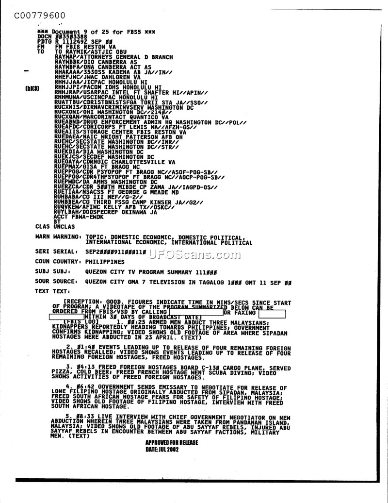 This document is an intelligence summary of a television program broadcast by GMA 7 in Quezon City, Philippines, on September 11, 2000. The broadcast provided updates on several security-related events in the region. The report details the abduction of three Malaysians by armed men heading toward the Philippines, noting that video footage of the area where Sipadan hostages were previously abducted was shown. The program also covered the release of four remaining foreign hostages and their subsequent activities, including boarding a C-130 cargo plane and engaging in recreational activities like scuba diving. Furthermore, the broadcast reported on the Philippine government's efforts to negotiate the release of a lone Filipino hostage, including an interview with a freed South African hostage. Finally, the program featured a live interview with a chief government negotiator regarding the new abduction of the three Malaysians and included footage of Abu Sayyaf rebels and military encounters involving Abu Sayyaf factions.