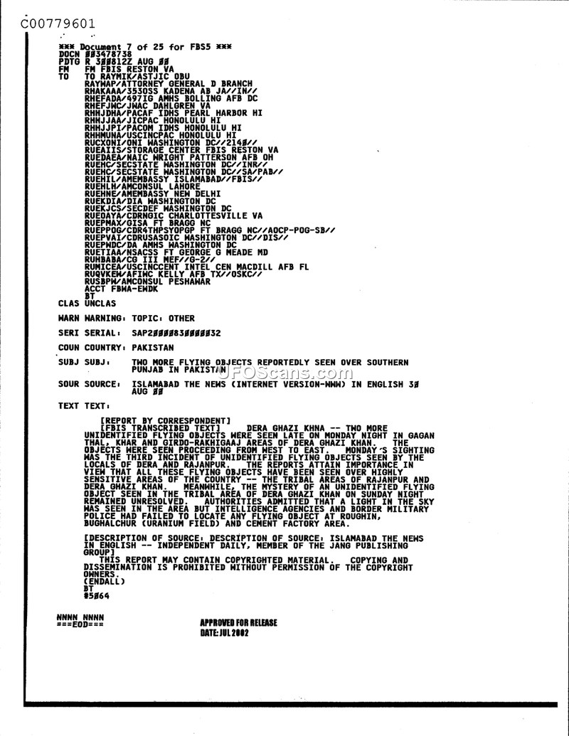 This report documents multiple sightings of unidentified flying objects over sensitive areas in southern Punjab, Pakistan, in August 2002. Despite investigations by local intelligence and military authorities, the objects remained unidentified.