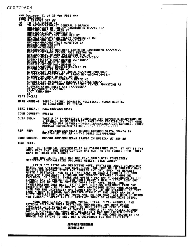 This intelligence report, issued by FBIS Reston on September 22, 1992, details the investigation into the disappearance of five female students in Barnaul, Russia. The document examines the circumstances surrounding the case, specifically addressing the lack of evidence for forced abduction via traditional means such as chloroform or physical restraint. The report highlights witness testimony, including an account from August 19, where a young man was observed grabbing a student by the arm at the Technical University. The text posits that the victims, identified as Yulya, Lilya, Olya, Anzhela, and Ksyusha, may have been coerced or influenced to follow their abductor willingly, with the report suggesting the possibility of hypnosis. The document also references potential motives for the kidnappings, including human trafficking for slavery, organ transplantation schemes, or medical experimentation. The report serves as a summary of findings published in the Komsomolskaya Pravda newspaper.