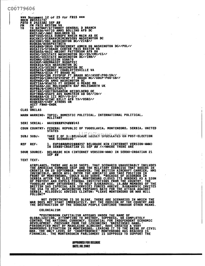 This intelligence cable, issued by FBIS Reston on September 24, 1998, provides a summary of a Belgrade weekly publication's analysis regarding potential post-election war scenarios in the Federal Republic of Yugoslavia, specifically focusing on Montenegro. The report outlines a hypothetical scenario where the British aircraft carrier HMS Invincible positions itself off the coast of Montenegro. It suggests that in the event of civil disorder following elections, the Yugoslav Army might intervene. The text further alleges that 15,000 members of the British Special Air Service (SAS) would arrive to support the Montenegrin leader, Djukanovic, and that the United States would prepare NATO for an attack against Serbia. The document notes a warning from the Serbian leader, Milosevic, to US President Clinton, stating, 'Leave Montenegro or war will follow.' Additionally, the document discusses the broader geopolitical context, characterizing Western influence as a form of 'postmodern capitalism' or 'globalization' aimed at controlling national currencies and economic development. It specifically mentions pressure from a group associated with Zbigniew Brzezinski and Madeleine Albright as contributing to a dangerous situation in Montenegro, pushing the region toward the brink of civil war.