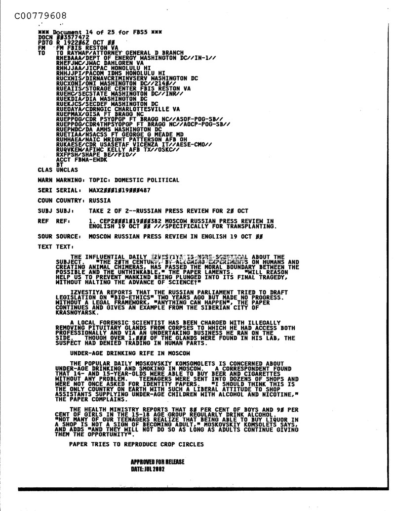 This FBIS press review from October 1990 summarizes Russian media reports on bio-ethics, illegal organ harvesting in Krasnoyarsk, and under-age substance abuse in Moscow. It also briefly notes an attempt to reproduce crop circles.