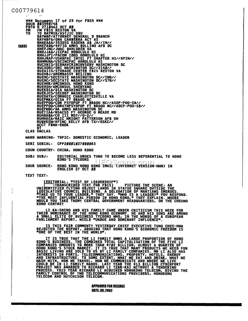 This document is a press compilation from the Foreign Broadcast Information Service (FBIS) dated October 27, 2002. It contains an editorial titled 'Test of Leadership' originally published in the Hong Kong Imail. The editorial uses a hypothetical scenario involving the arrival of Martians in Hong Kong to critique the political and economic leadership of Chief Executive Tung Chee-hwa. The core of the editorial focuses on the perceived excessive influence of the Li Ka-shing family over the Hong Kong economy. The text notes that the Li family controls a significant portion of the stock market and various sectors including ports, telecommunications, property, hotels, and energy. The editorial highlights criticism regarding the lack of a tendering process for the Cyberport project, which was awarded to Richard Li Tzar-kai. Chief Executive Tung Chee-hwa is mentioned as having rejected a European Parliament report that criticized the dominance of business tycoons in Hong Kong, maintaining that the region's economic freedom remains among the best in the world.