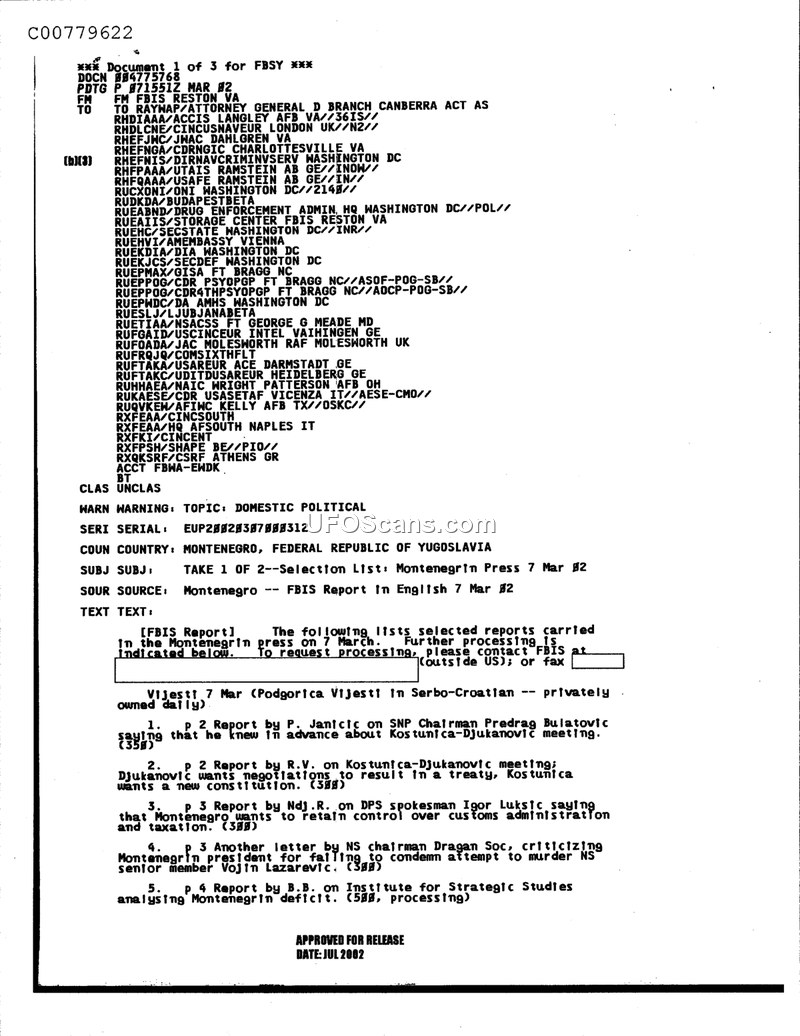 This document is a Foreign Broadcast Information Service (FBIS) report dated March 7, 2002, summarizing selected reports from the Montenegrin press. The document outlines five specific news items reported in the Podgorica daily 'Vijesti'. The first report, by P. Janicic, concerns SNP Chairman Predrag Bulatovic and his prior knowledge of a meeting. The second report, by R.V., discusses a meeting between Kostunica and Djukanovic, noting Djukanovic's desire for negotiations to lead to a new constitution. The third report, by Ndj.R., covers DPS spokesman Igor Luksic, who stated that Montenegro intends to maintain control over customs administration and taxation. The fourth report details a letter from NS chairman Dragan Soc, who criticized the Montenegrin president for failing to condemn an attempt to murder senior NS member Vojin Lazarevic. Finally, the fifth report, by B.B., mentions an analysis of the Montenegrin deficit by the Institute for Strategic Studies.