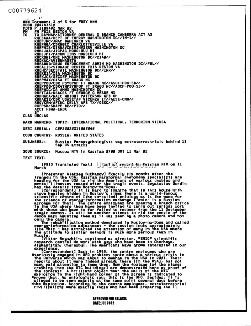 This document is an intelligence report from the Foreign Broadcast Information Service (FBIS) dated March 11, 2002. It summarizes a report broadcast by the Russian television network NTV regarding claims made by the 'ENIO' scientific research centre. According to the broadcast, Russian paranormal specialists, led by Viktor Rogozhkin, asserted that extraterrestrial civilizations were responsible for the September 11, 2001, terrorist attacks in the United States. The centre claimed that in 1995, its employees had predicted a crisis in the universe that would emerge in the USA in 2001. The report highlights that these individuals pointed to a 'brilliant object' visible in video footage of the World Trade Center buildings as evidence of a UFO. They further alleged that this object was seen at the same location several days prior to the explosion. The document notes that the ENIO centre was planning to open a branch in the United States to assist individuals suffering from trauma related to the September 11 events using a method they termed 'energy-information adjustment.'