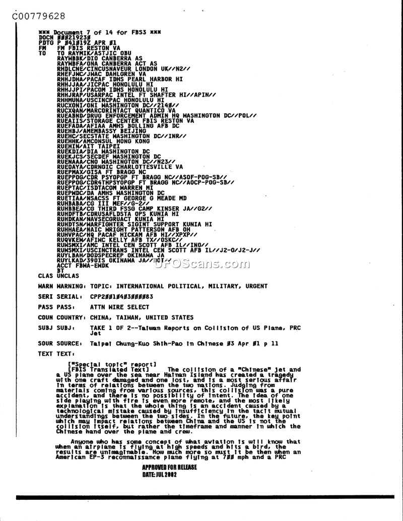 TAKE 1 OF 2--Taiwan Reports on Collision of US Plane, PRC Jet