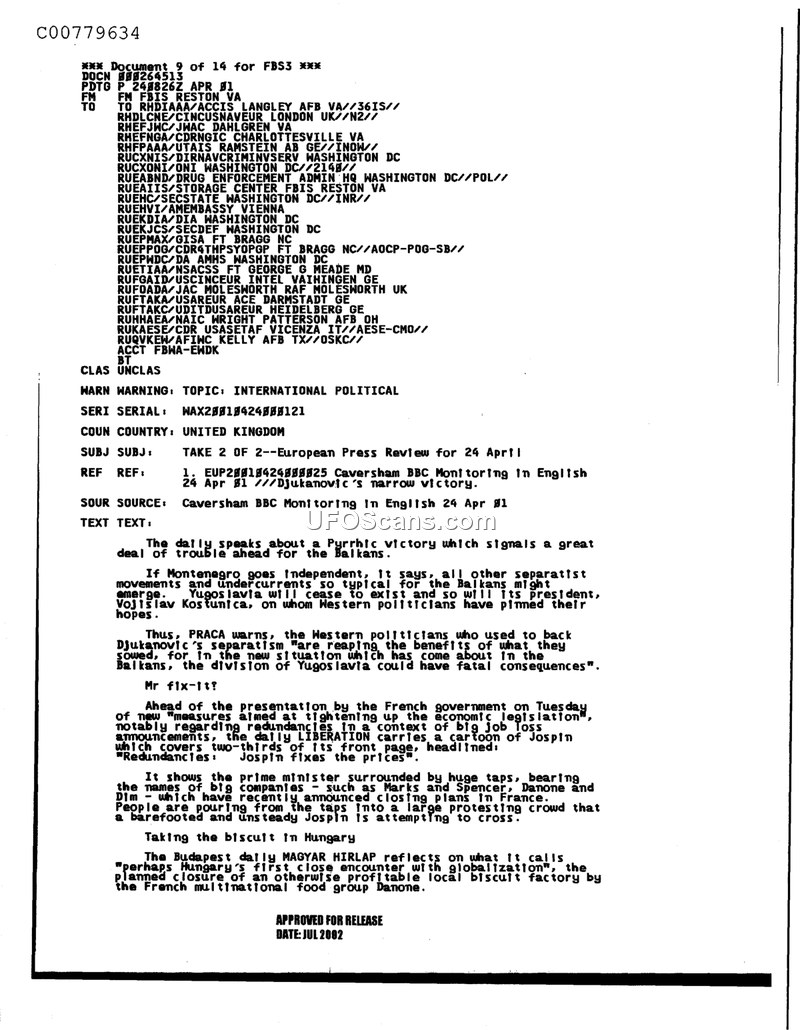 This document is a press review compiled by FBIS Reston, Virginia, dated 24 April 2001. It summarizes international political commentary from various sources. The report begins by discussing the political situation in the Balkans, specifically noting that the daily press views the recent victory of Djukanovic as a Pyrrhic victory that could lead to the dissolution of Yugoslavia and the end of President Vojislav Kostunica's tenure. The report also highlights French political discourse, mentioning a cartoon in the daily newspaper LIBERATION that depicts Jospin in the context of new economic legislation and corporate downsizing by companies such as Marks and Spencer and Danone. Finally, the document notes that the Hungarian daily MAGYAR HIRLAP reflects on the planned closure of a local biscuit factory by the French multinational group Danone, characterizing it as Hungary's first close encounter with globalization.