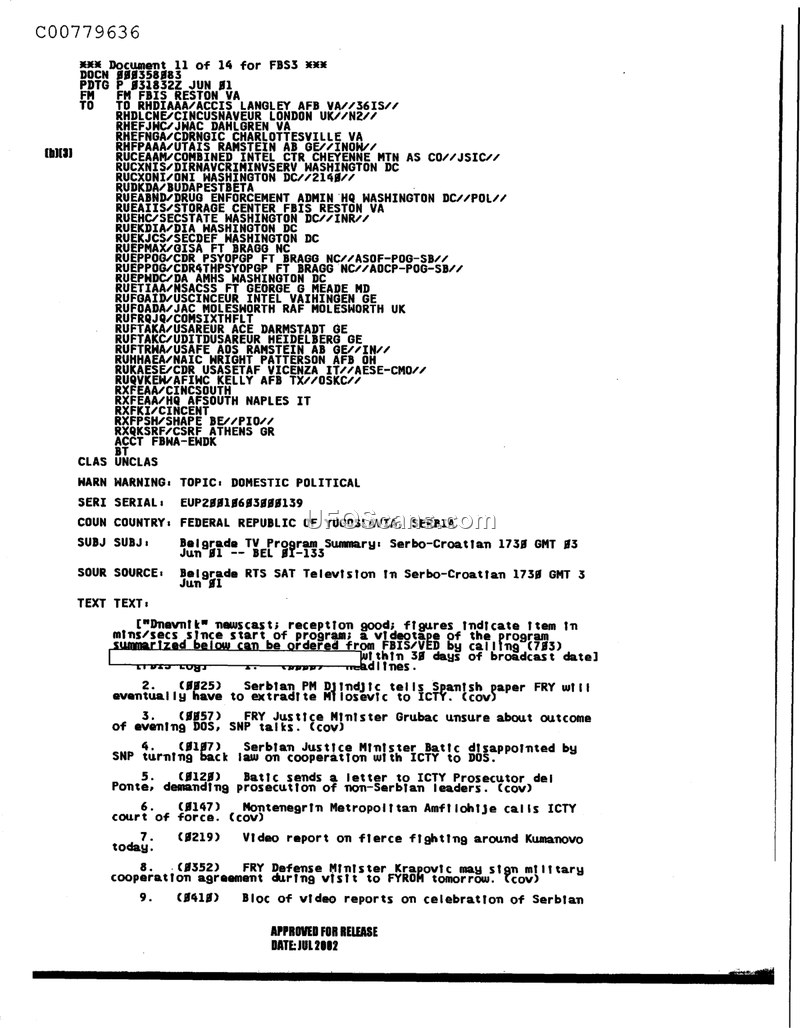 This document provides a summary of a June 3, 2001, Belgrade television newscast covering political tensions in the Federal Republic of Yugoslavia, including ICTY extradition issues and regional military cooperation.