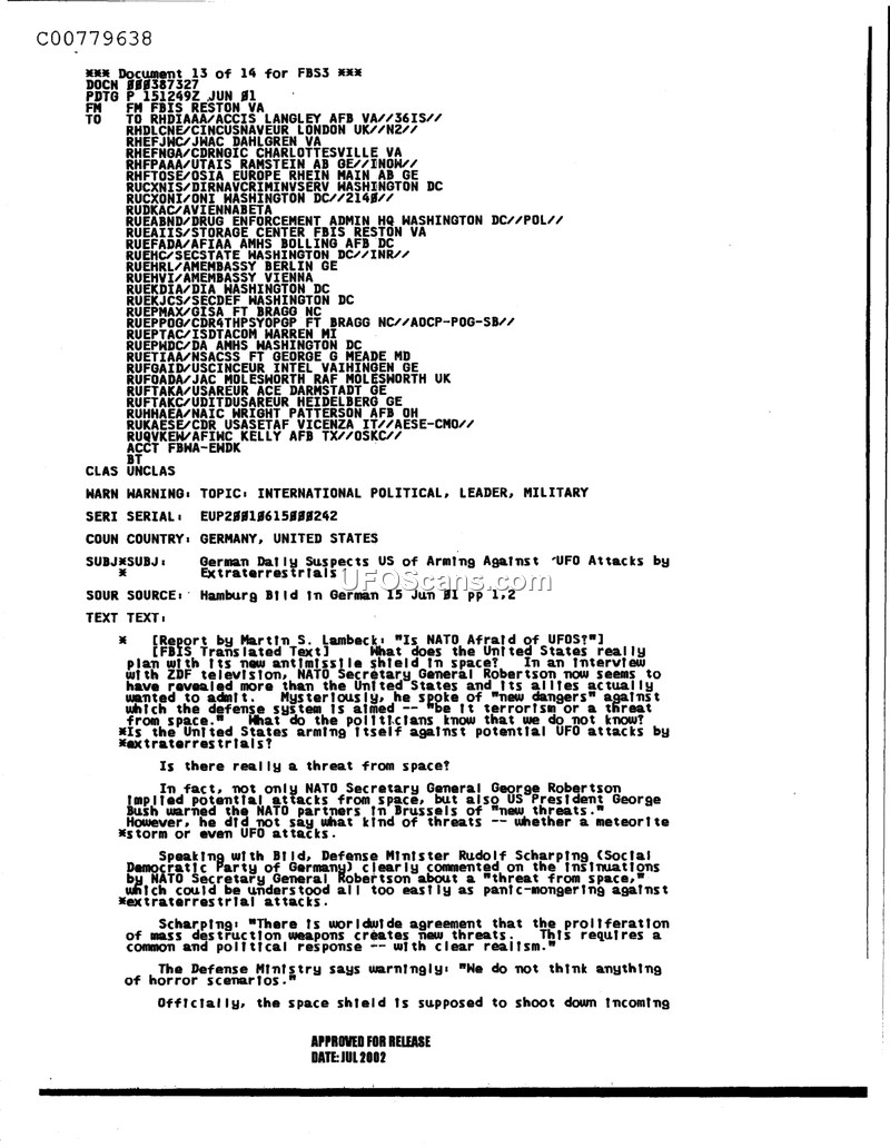 This document is an intelligence report from the Foreign Broadcast Information Service (FBIS) dated June 1, 2001. It summarizes a news report by Martin S. Lambeck published in the German newspaper 'Bild' on June 15, 2001. The core of the report concerns public and media speculation in Germany regarding the true purpose of the United States' proposed space-based missile defense shield. The report highlights that NATO Secretary General George Robertson and US President George Bush had alluded to 'new threats' from space in recent statements. This ambiguity led to public questioning about whether these defenses were intended to counter potential UFO attacks. In response to these insinuations, German Defense Minister Rudolf Scharping, representing the Social Democratic Party of Germany, publicly criticized the narrative, characterizing it as 'panic-mongering.' Scharping emphasized that the international consensus regarding the proliferation of mass destruction weapons is the actual driver for new security threats, which should be addressed with political realism rather than horror scenarios. The document serves as a record of how political rhetoric regarding space defense was interpreted by European media and addressed by German officials at the time.