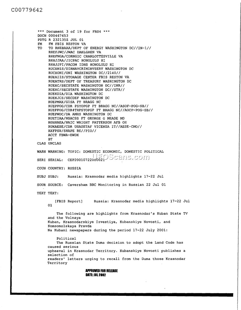This document is an FBIS report dated July 23, 2001, providing a summary of media highlights from the Krasnodar Territory in Russia for the period of July 17-22, 2001. The report synthesizes information from several local media outlets, including Kuban State TV, Volnaya Kuban, Krasnodarskiye Izvestiya, Kubanskiye Novosti, and Komsomolskaya Pravda Na Kubani. The primary focus of the report is the political climate in the region following the Russian State Duma's decision to adopt the Land Code. This legislative action resulted in significant political upheaval within the Krasnodar Territory. Specifically, the newspaper Kubanskiye Novosti published a collection of letters from readers who were expressing their dissatisfaction with the decision and urging for the recall of the Krasnodar Territory's representatives from the State Duma.