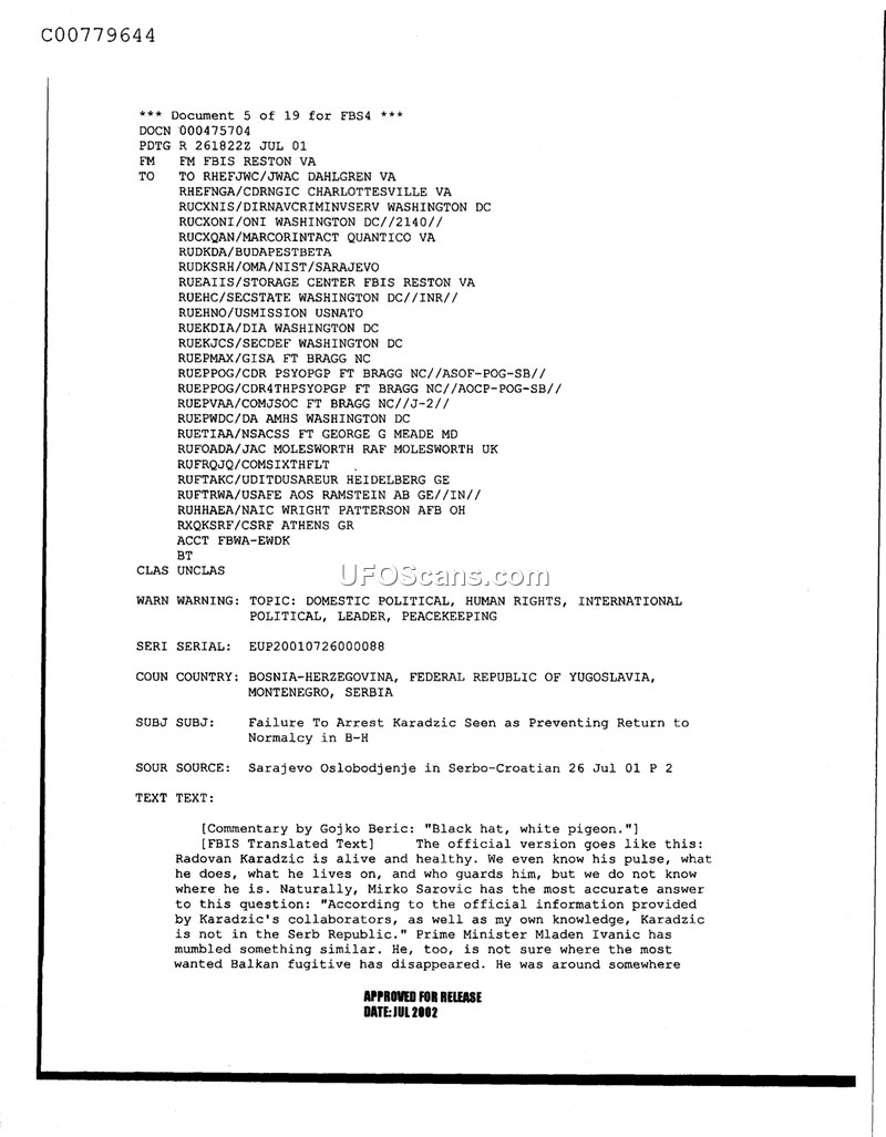 This document is an intelligence report from the Foreign Broadcast Information Service (FBIS) dated July 26, 2001. It provides a translation of a commentary by Gojko Beric titled 'Black hat, white pigeon.' The central theme of the report is the continued evasion of capture by Radovan Karadzic, a prominent Balkan fugitive. The text notes that while Karadzic is widely believed to be alive and healthy, official sources, including Mirko Sarovic and Prime Minister Mladen Ivanic, maintain a stance of ignorance regarding his specific location or the identity of his protectors. The commentary implies that the failure to apprehend Karadzic is a significant obstacle to achieving normalcy in Bosnia-Herzegovina. The document was distributed to various military and intelligence entities, including NATO and US military commands in Europe and the United States.