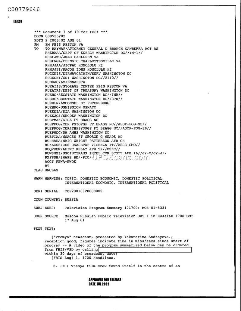 This document is an FBIS intelligence summary of a Russian television broadcast from August 17, 2001. It identifies the presenter and notes the content of the Vremya newscast.