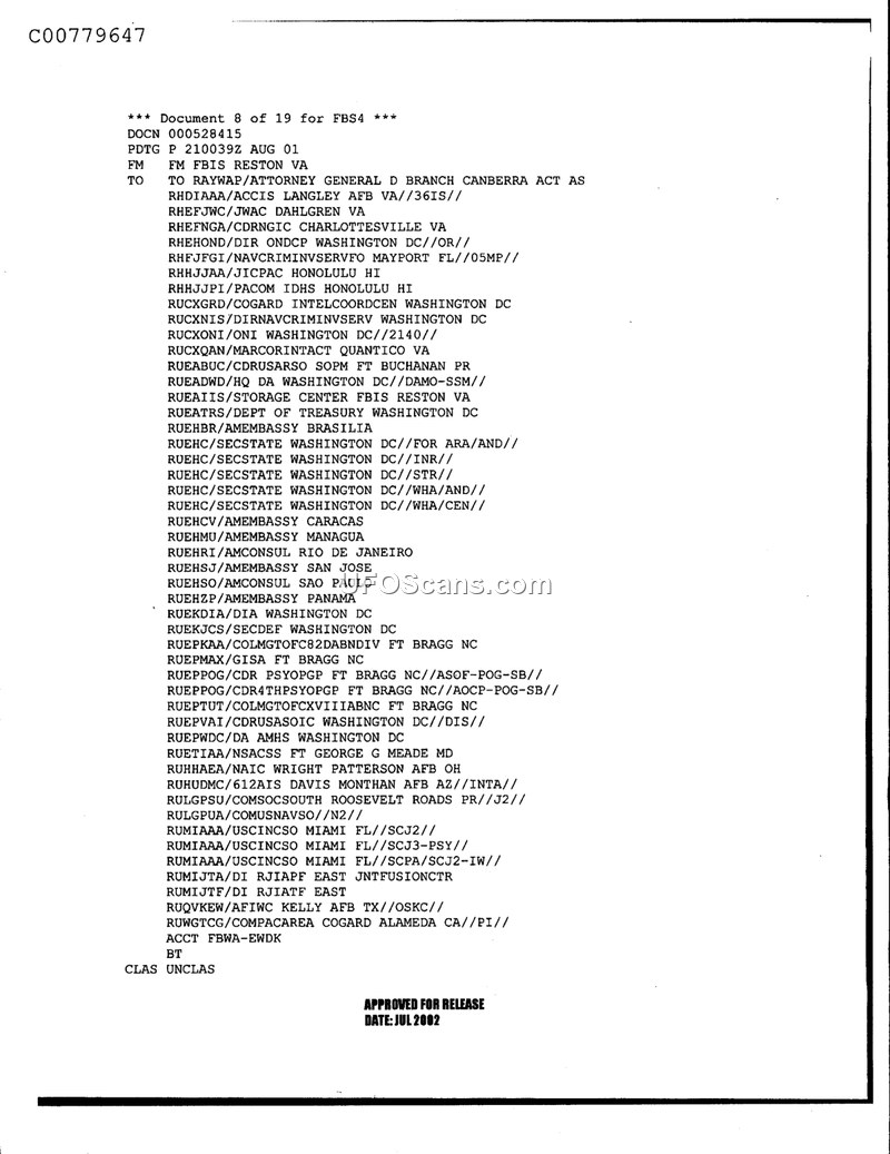 This document is a distribution list generated by the Foreign Broadcast Information Service (FBIS) in Reston, Virginia, dated August 21, 2001. It serves as a routing record for document number 000528415. The document is addressed to the Attorney General D Branch in Canberra, Australia, and lists a wide array of military, intelligence, and diplomatic recipients. These include various commands under the Department of Defense, such as the Defense Intelligence Agency (DIA), the Secretary of Defense (SECDEF), and the U.S. Southern Command (USCINCSO). It also lists numerous diplomatic posts, including embassies and consulates in Brasilia, Managua, Rio de Janeiro, San Jose, Sao Paulo, and Panama. The document is marked as unclassified and was approved for release in July 2002.