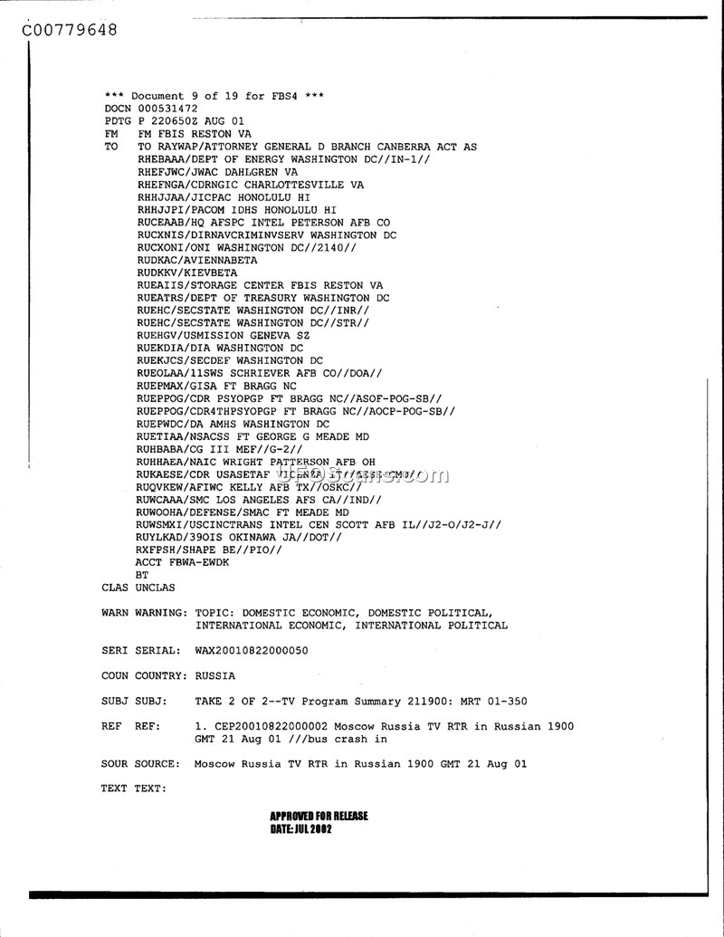 This document is an intelligence summary produced by the Foreign Broadcast Information Service (FBIS) in Reston, Virginia, dated August 22, 2001. It serves as a transmission record for a TV program summary (MRT 01-350) covering events from August 21, 2001. The document explicitly references a bus crash in Russia as the subject of the broadcast summary. It is addressed to a wide array of military and government intelligence agencies, including the Department of Energy, the Defense Intelligence Agency, and various regional commands. The document is marked as unclassified and was approved for release in July 2002.