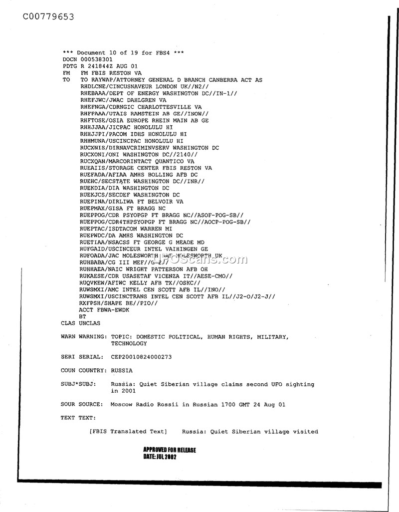 This document is a Foreign Broadcast Information Service (FBIS) intelligence report dated August 24, 2001. It serves as a transmission of a news item originally sourced from Moscow Radio Rossii. The report highlights a claim regarding a second UFO sighting occurring in a quiet Siberian village during the year 2001. The document is classified as unclassified and was approved for release in July 2002. It contains a distribution list of various United States military and intelligence agencies.