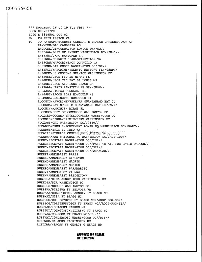 This document is a formal distribution list for a communication identified as document number 000703728, issued by FBIS Reston, VA, on October 18, 2001. The document serves to record the various military, intelligence, and government agencies to which the primary communication was transmitted. The list includes a wide array of recipients, ranging from the Attorney General and the Department of State to various military commands such as PACOM, COMJSOC, and the 82nd Airborne Division. Specific instructions are noted for the Department of State to pass information to an individual named David Dalton. The document was approved for release in July 2002.