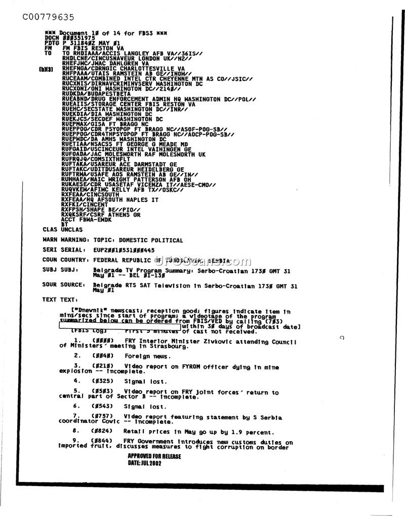 This document is an intelligence summary produced by the Foreign Broadcast Information Service (FBIS) in Reston, Virginia, dated May 31, 1991. It provides a summary of the 'Dnevnik' newscast aired on Belgrade RTS SAT Television at 1730 GMT on the same day. The report outlines nine specific news items covered during the broadcast. The first item notes that the FRY Interior Minister, Zivkovic, was attending a Council of Ministers meeting in Strasbourg. The second item covers general foreign news. The third item reports on a FYROM officer who died in a mine explosion, though the report is noted as incomplete. The fourth and sixth items indicate a loss of signal. The fifth item mentions a video report regarding the return of FRY joint forces to the central part of Sector B, also noted as incomplete. The seventh item features a statement by the S Serbia coordinator, Covic, which is also incomplete. The eighth item reports that retail prices were expected to rise by 1.9 percent. Finally, the ninth item discusses the FRY Government's introduction of new customs duties on imported fruit and measures to combat border corruption. The document is marked as unclassified and was approved for release in July 2002.