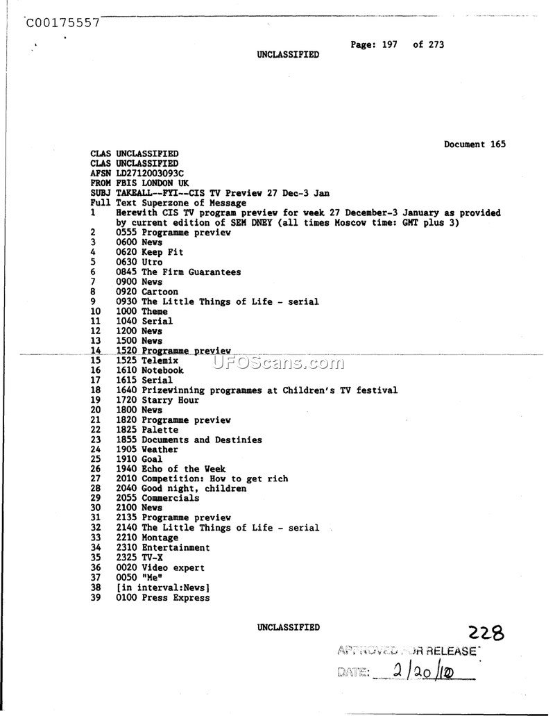 This document is an unclassified briefing note issued by the Foreign Broadcast Information Service (FBIS) in London, UK. It provides a television program schedule for the Commonwealth of Independent States (CIS) for the period of December 27 through January 3. The schedule lists various programs, including news, fitness segments, cartoons, serials, and cultural content, with times provided in Moscow time (GMT plus 3). The document serves as a routine informational update regarding media programming.