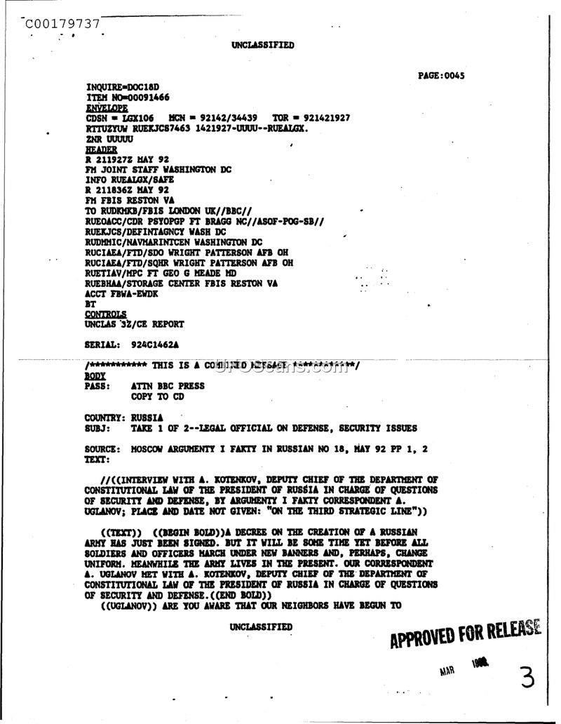 This document is a Foreign Broadcast Information Service (FBIS) report dated May 21, 1992, summarizing an interview conducted by the Russian publication Argumenty I Fakty. The interview features A. Uglanov speaking with A. Kotenkov, the Deputy Chief of the Department of Constitutional Law of the President of Russia, who is responsible for security and defense matters. The primary focus of the discussion is the formal establishment of a Russian Army. Kotenkov confirms that a decree for the creation of the Russian Army has been signed. He acknowledges the practical challenges of this transition, noting that it will take time for all soldiers and officers to be equipped with new uniforms and to march under new banners, emphasizing that the army is currently in a state of transition.