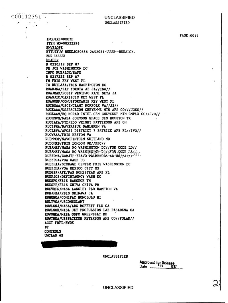 This document is a communication routing slip issued by the Joint Chiefs of Staff (JCS) in Washington D.C. on September 2, 1987. It serves as a distribution list for a specific item, identified as item number 00522598. The document lists a wide array of military, intelligence, and governmental organizations, including various NASA facilities, NORAD intelligence centers, the Foreign Broadcast Information Service (FBIS), and several regional military commands such as USSPACECOM, COMUSFORCARIB, and COMIPAC. The document is marked as unclassified and indicates it was approved for release in August 1997. No specific content regarding the subject matter of the referenced item is provided in this routing slip.