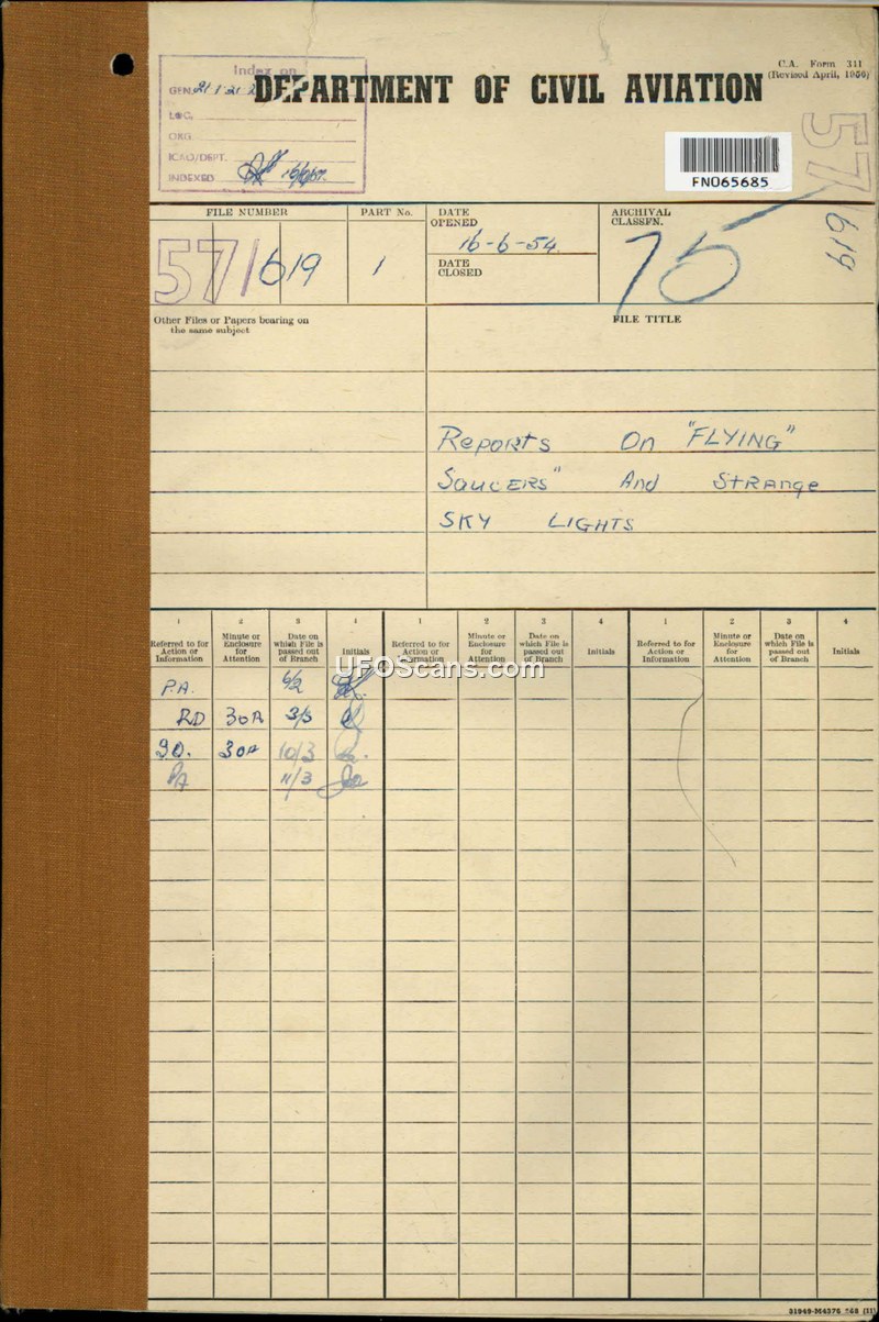 Department of Civil Aviation File 57/619: Reports on Flying Saucers and Strange Sky Lights