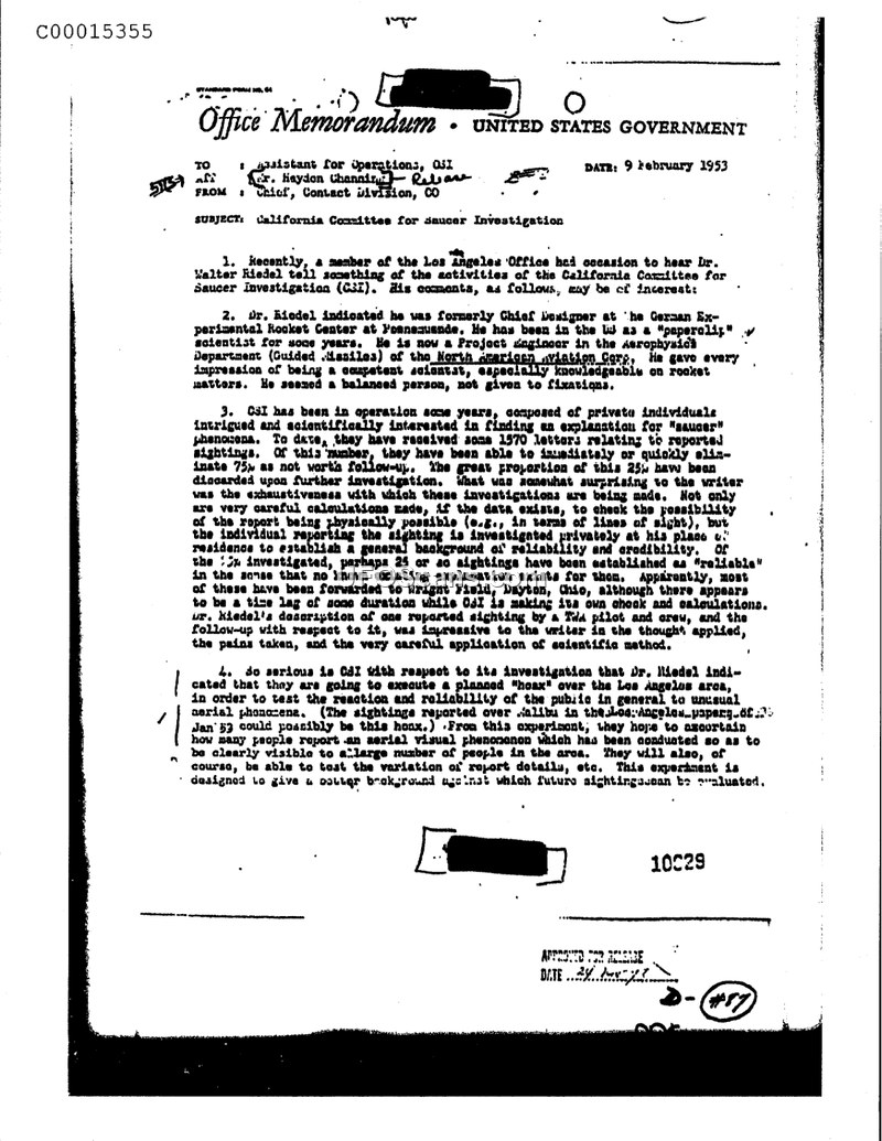 This February 9, 1953, office memorandum from the Chief of the Contact Division to the Assistant for Operations at OJI details the activities of the California Committee for Saucer Investigation (CSI). The document highlights the involvement of Dr. Walter Riedel, a former Chief Designer at the German Experimental Rocket Center who was then employed as a project engineer at North American Aviation. The author notes that CSI, composed of private individuals, claimed to be conducting rigorous scientific investigations into saucer sightings, having discarded 75% of reports as requiring no further action while vetting the remainder for reliability. The memorandum reveals that CSI planned to conduct a 'hoax' in the Los Angeles area in January 1953, involving the creation of an aerial visual phenomenon to test public reaction and the accuracy of witness reports. Furthermore, the document mentions that the National aeronautical association had requested that Dr. Riedel disassociate himself from the committee. The memorandum also references an interest in the committee's work regarding sightings as observed in a paper titled 'Rockets Behind the Iron Curtain,' presented by George F. Sutton at the American Rocket Society convention in New York in December 1952.