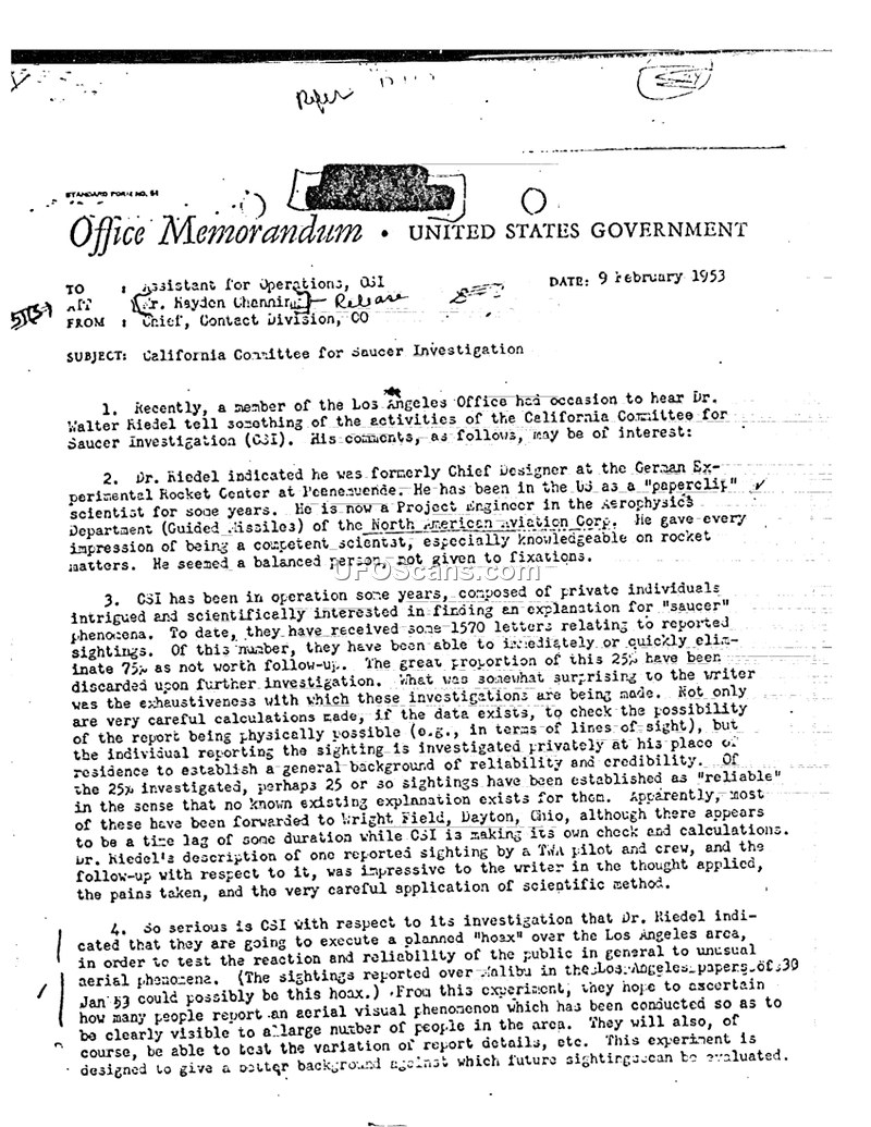 This memorandum, dated February 9, 1953, from the Chief of the Contact Division to the Assistant for Operations at the Office of Strategic Intelligence (OSI), details the activities of the California Committee for Saucer Investigation (CSI). The report is based on information provided by Dr. Walter Riedel, a former Chief Designer at the German Experimental Rocket Center at Peenemunde, who was then working as a Project Engineer at North American Aviation Corp. The author describes CSI as a group of private individuals who are scientifically interested in investigating 'saucer' phenomena. According to the document, CSI had received approximately 1570 reports, of which 75% were discarded after initial review. The remaining 25% were subjected to rigorous investigation, including verification of physical possibility and background checks on witnesses. The author expresses surprise at the thoroughness of these investigations. The document further reveals that CSI planned to conduct a 'hoax' in the Los Angeles area, specifically over Malibu on January 30, 1953, to test public reaction and the reliability of reporting regarding aerial phenomena. Additionally, the memorandum notes that interest in UFO sightings is also directed toward the Soviet Union, as evidenced by a paper titled 'Rockets Behind the Iron Curtain' presented by George P. Sutton at an American Rocket Society convention in December 1952. Finally, the document mentions that the National aeronautical association (NAA) had suggested that Dr. Riedel disassociate himself from the CSI.