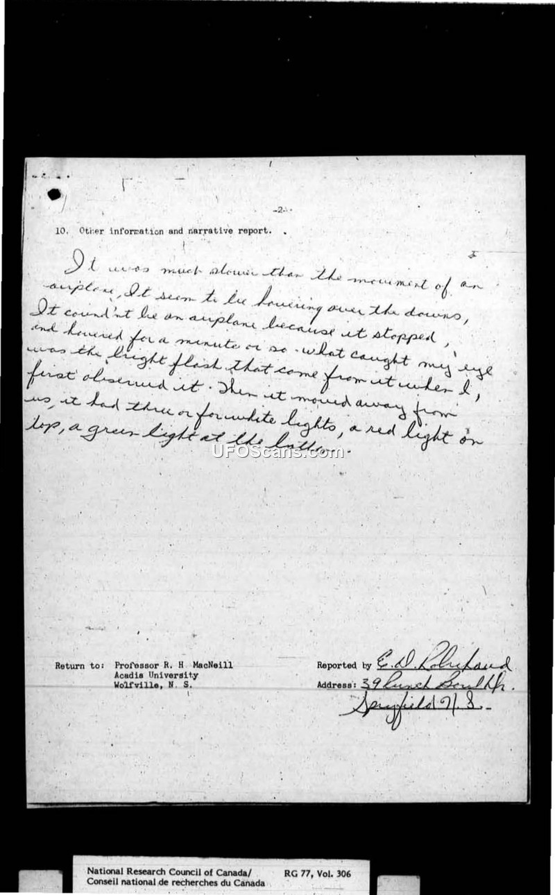 This document is a compilation of various reports, correspondence, and internal government communications regarding Unidentified Aerial Phenomena (UAP) or UFO sightings in Canada, primarily spanning the years 1968 and 1969. The collection includes standardized 'Meteorite/UFO Report of Sighting' forms, personal letters from witnesses to Professor R. H. MacNeill at Acadia University, and internal RCMP reports forwarded to the National Research Council (NRC). The reports describe a wide range of observations, including bright lights, glowing objects, and disc-shaped craft, often reported by multiple witnesses. Many reports include detailed descriptions of movement, color changes, and the absence of sound. Several witnesses mention contacting the RCMP, who often investigated and filed reports, though they frequently concluded that the sightings were either natural phenomena (such as planets, meteors, or weather balloons) or could not be definitively explained. The correspondence also highlights the public's frustration with the lack of official investigation or the perceived skepticism of authorities. The NRC, specifically through Dr. Peter M. Millman, often responded to these reports by providing scientific explanations, such as atmospheric conditions or astronomical events, while maintaining a record of the sightings. The document also contains internal RCMP telexes and reports regarding specific incidents, such as sightings near Fort Norman, Two Hills, and other locations, demonstrating a coordinated effort between the RCMP and the NRC to document and evaluate these reports.